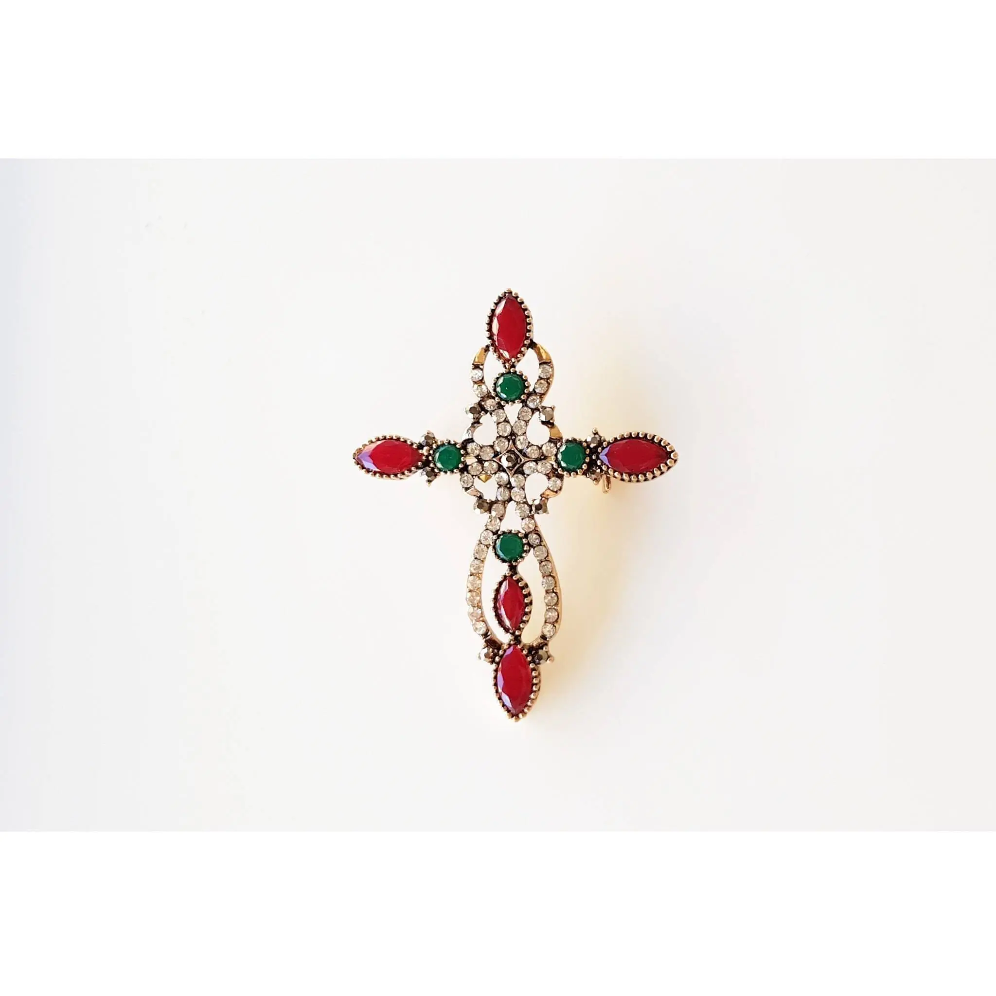 Broche cruz de piedras rojo oscuro y verde estilo vintage