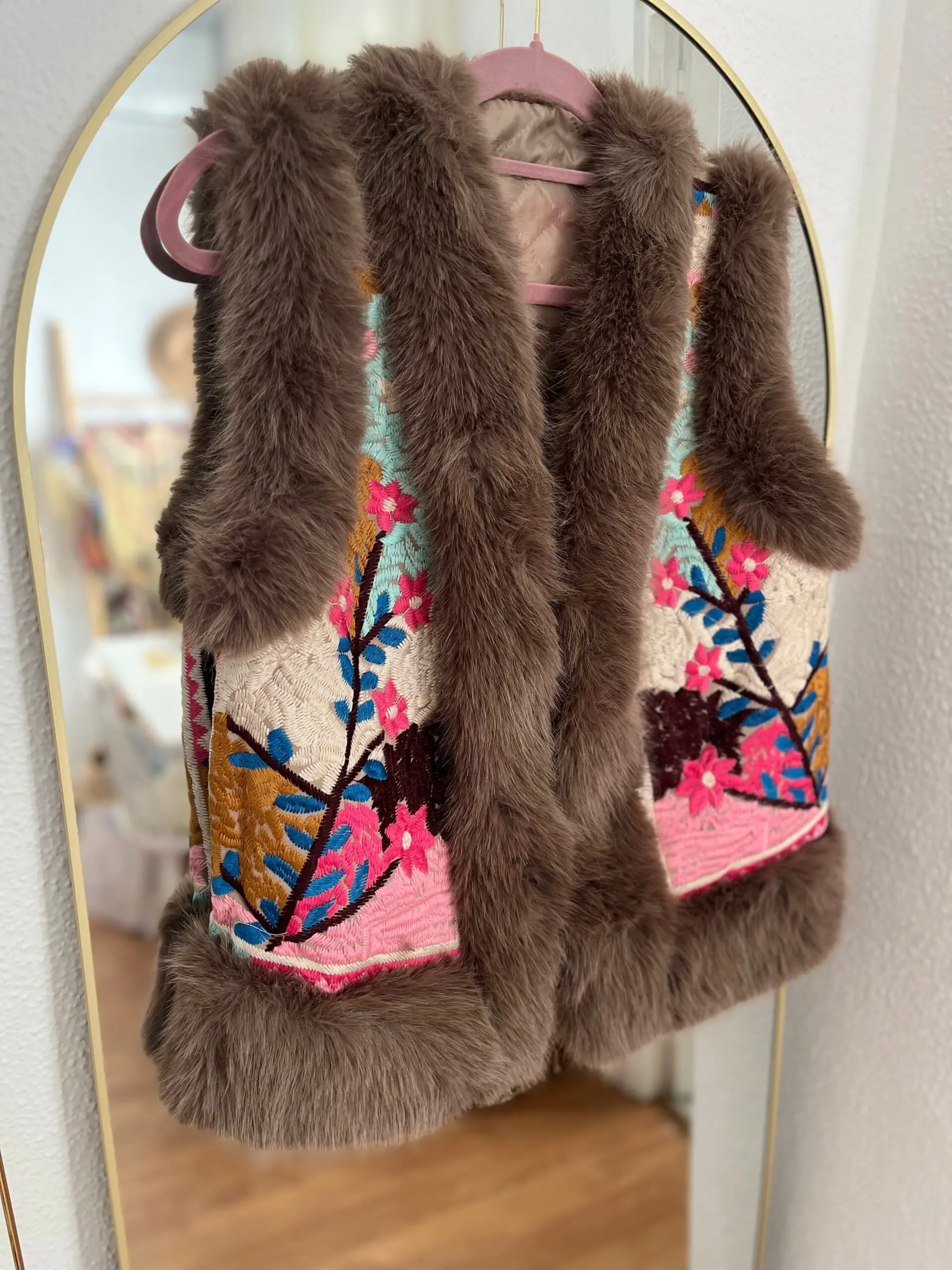 Chaleco de pelo enguatado con bordados de flores por delante y por detrás.