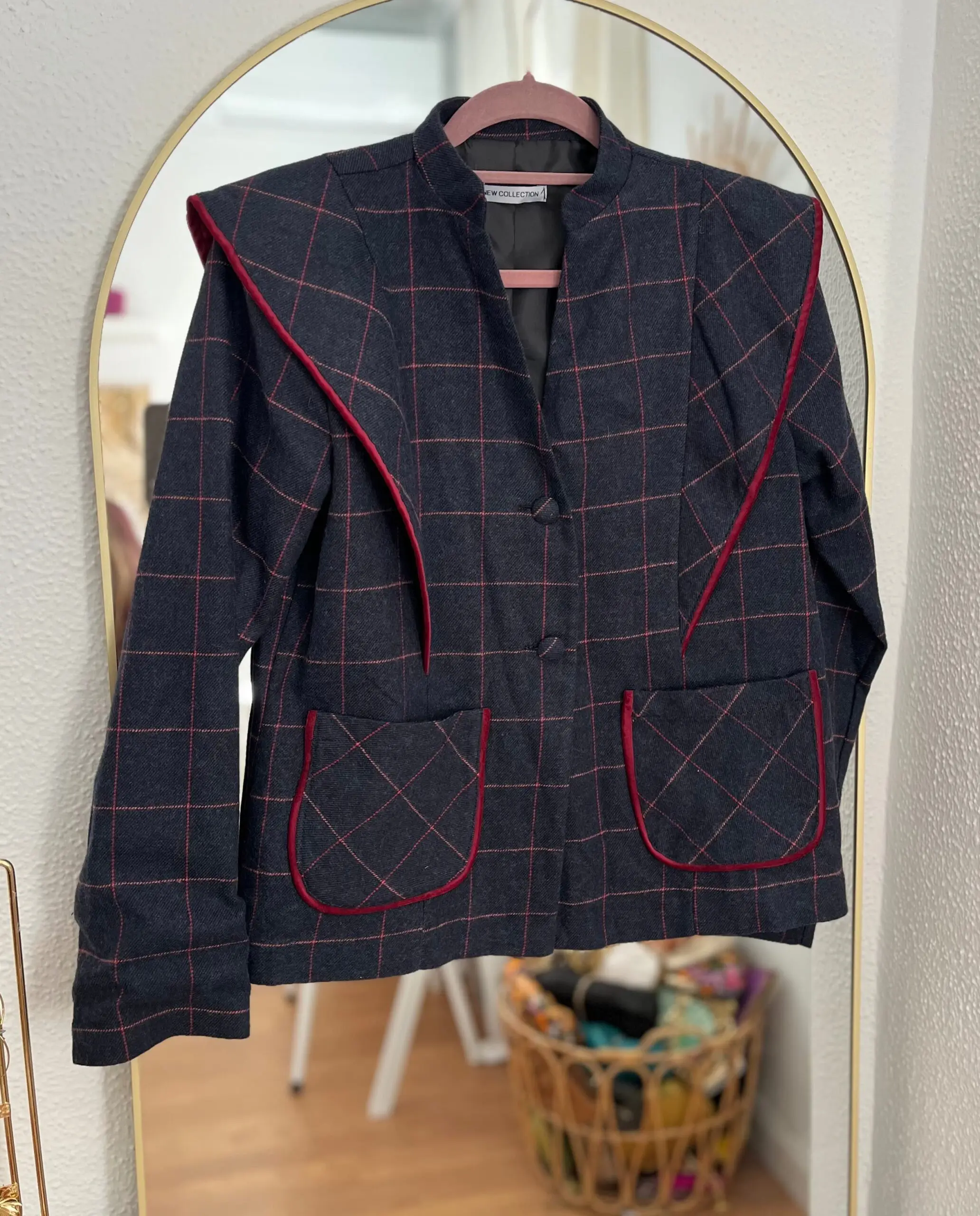 Chaqueta sastre entallada con cuadro inglés en tonos azules. Con hombreras marcadas y ribete azul que resalta el diseño. De corte clásico con un toque sofisticado y original.