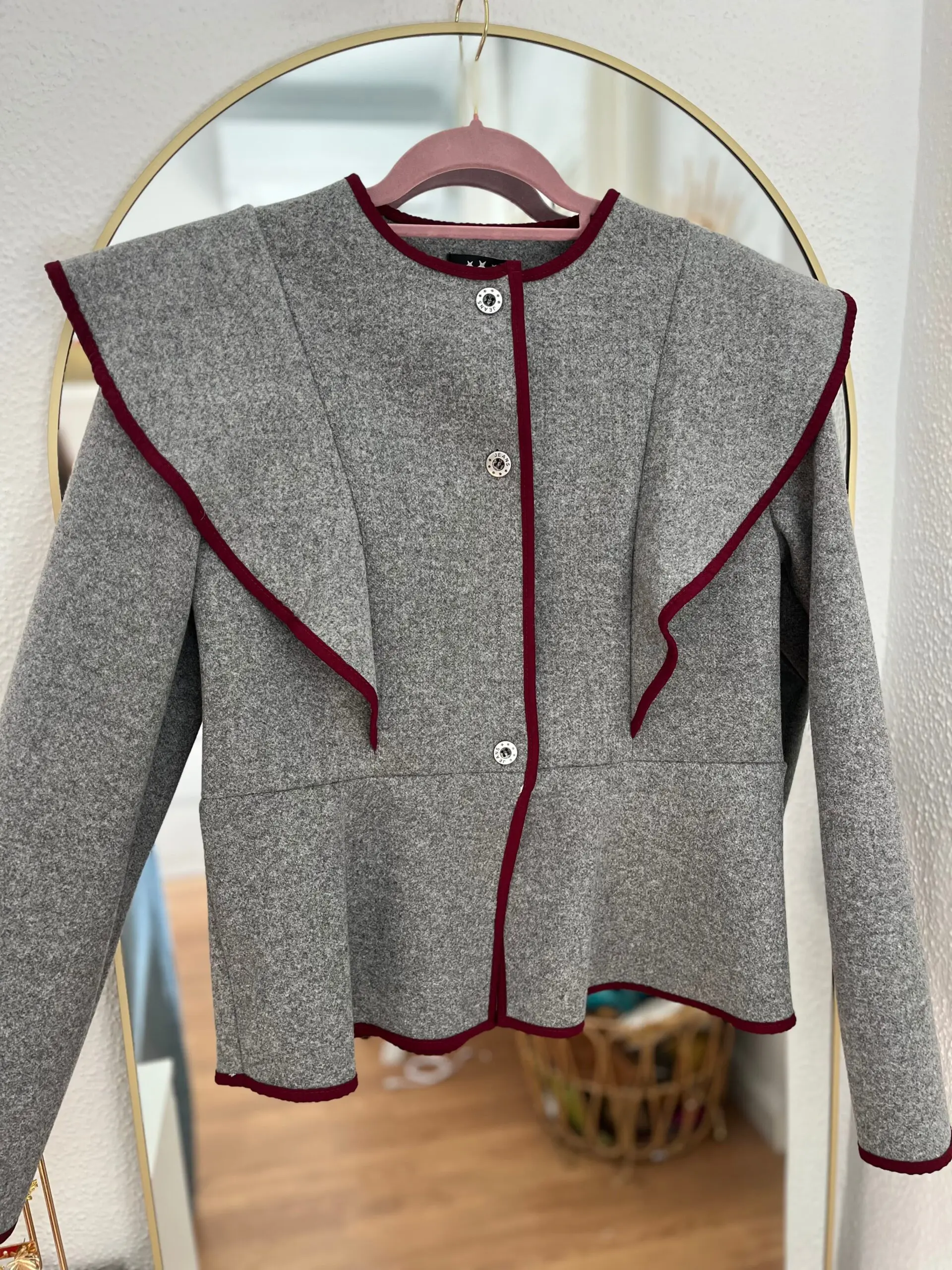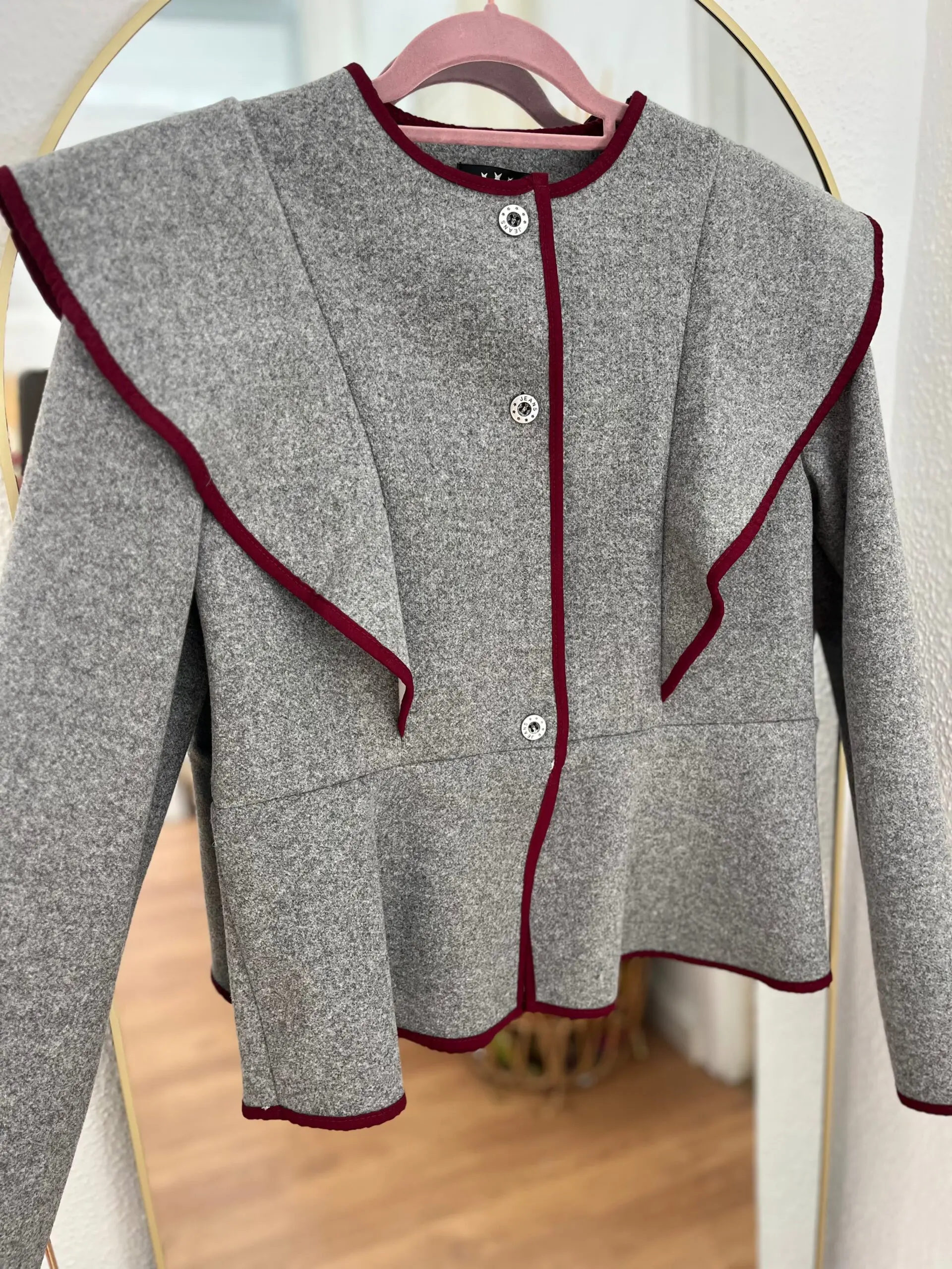 Chaqueta con corte estructurado con ribete en burdeos y hombreras marcadas que realzan la silueta. Cierre frontal con botones y diseño elegante que combina a la perfección con camisas o prendas básicas.
