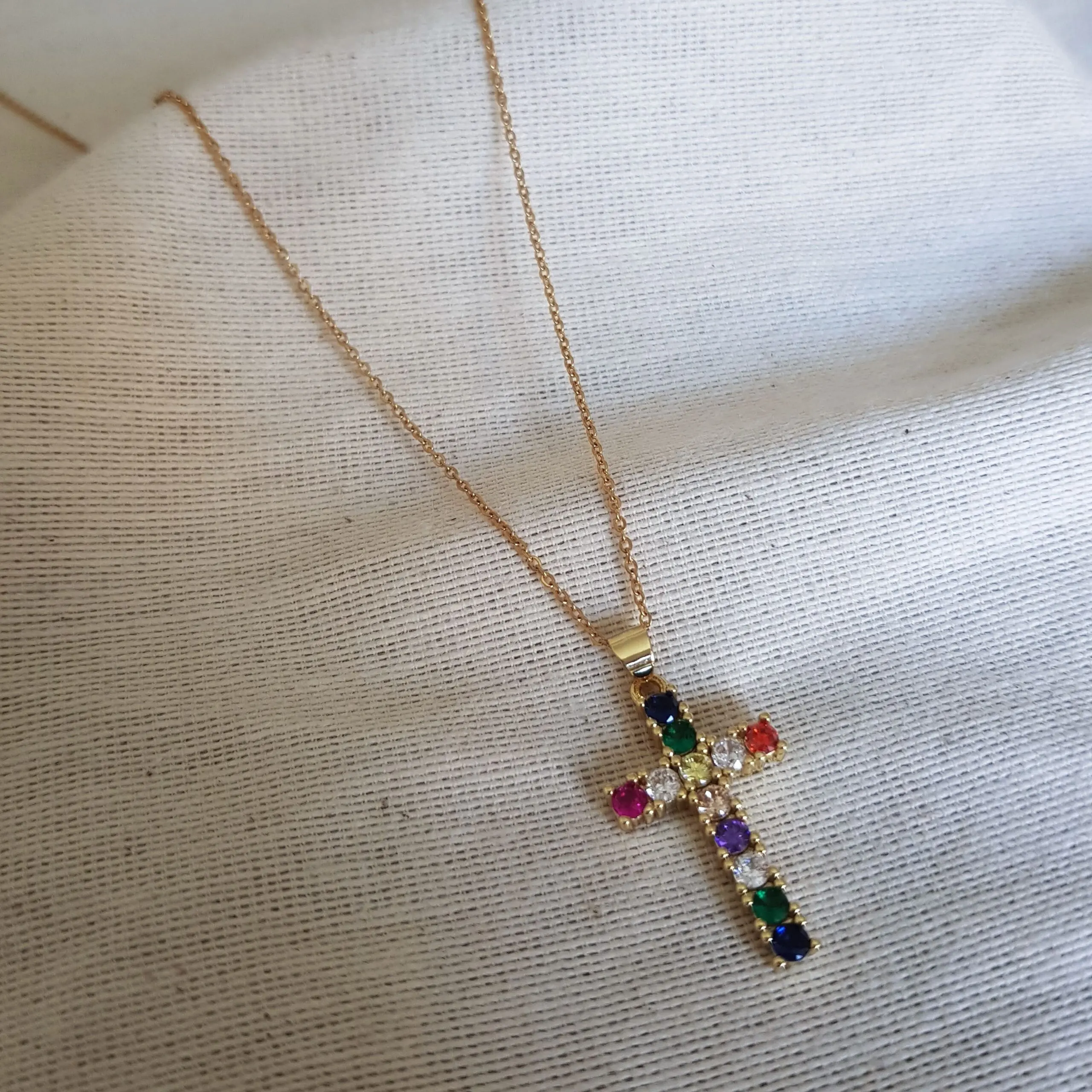 Collar con colgante de cruz con circonitas multicolor embarazadas