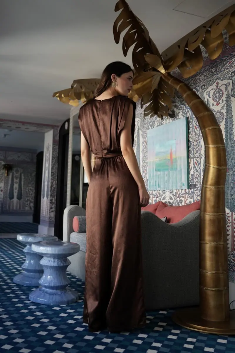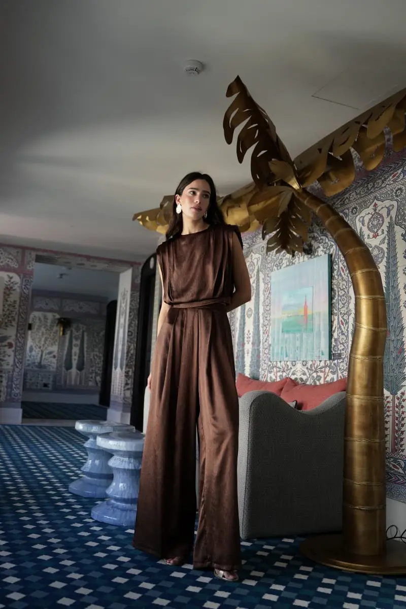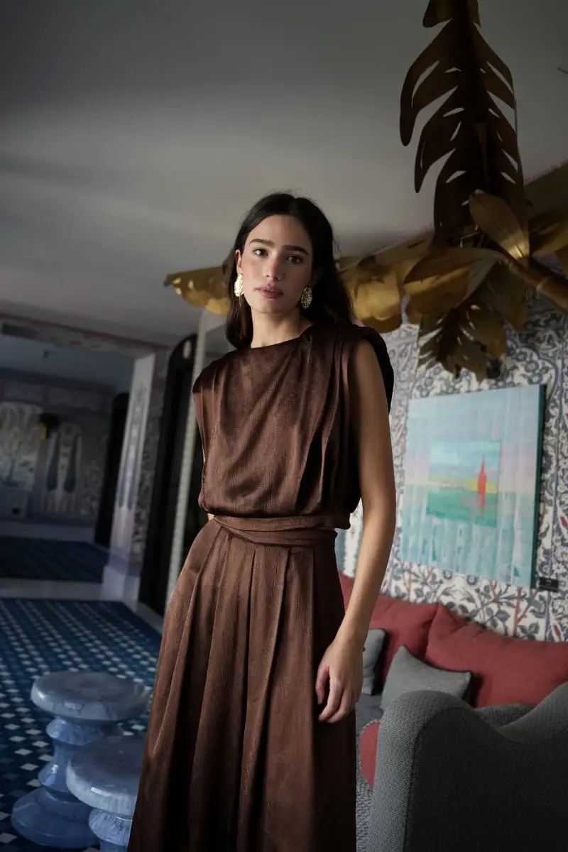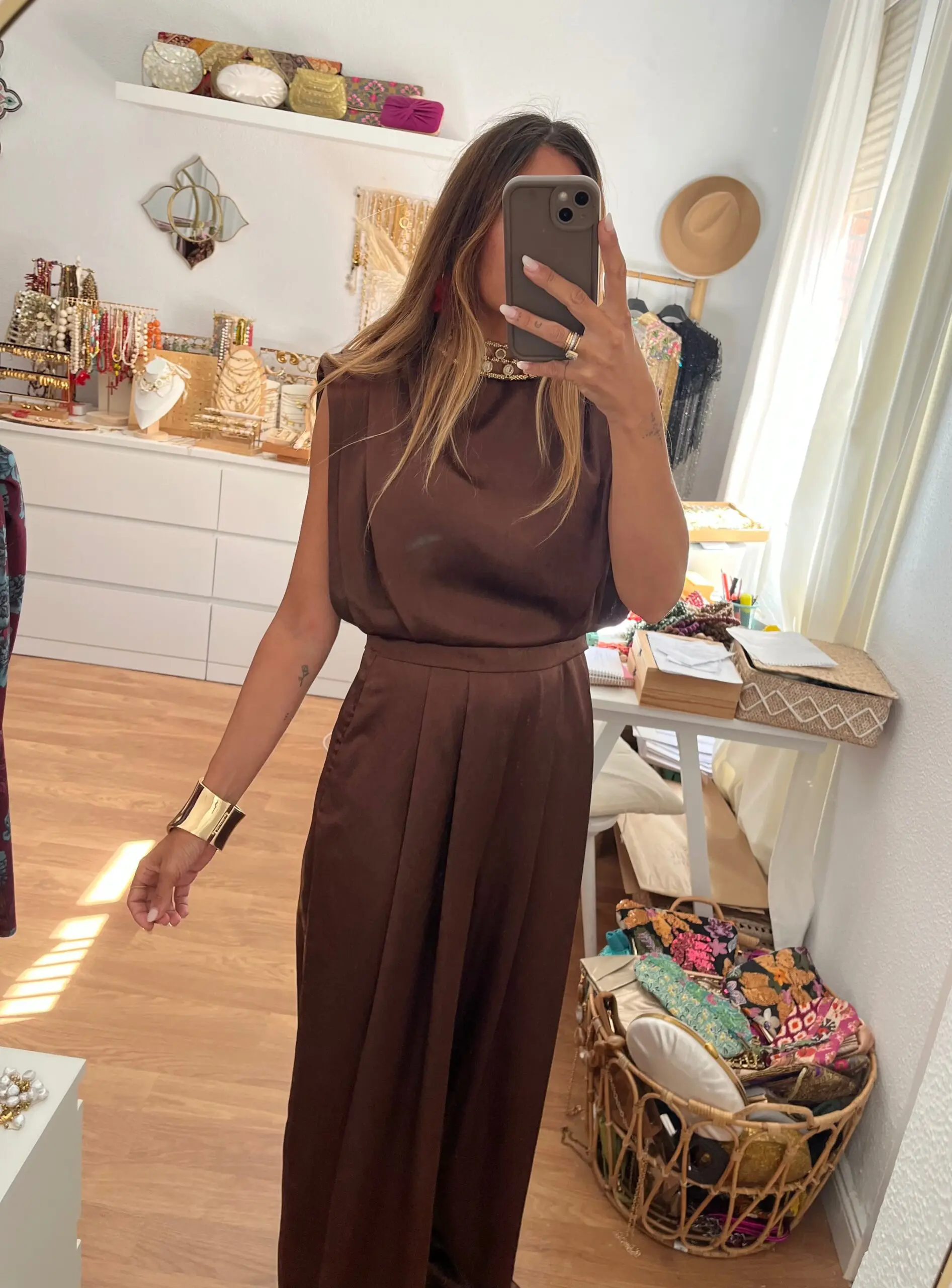 Conjunto de diseño nacional. Pantalón fluido y top en raso de brillo.
