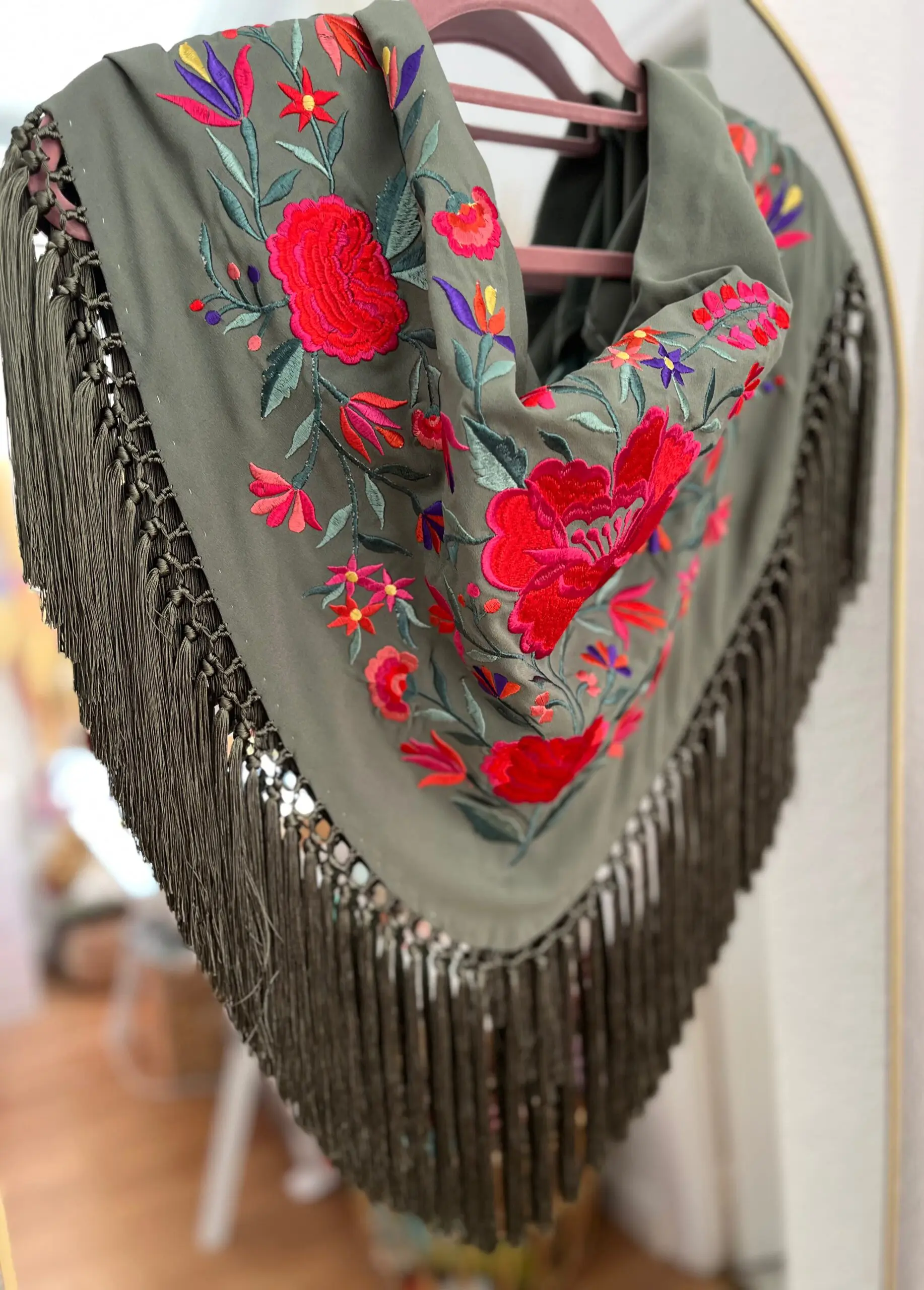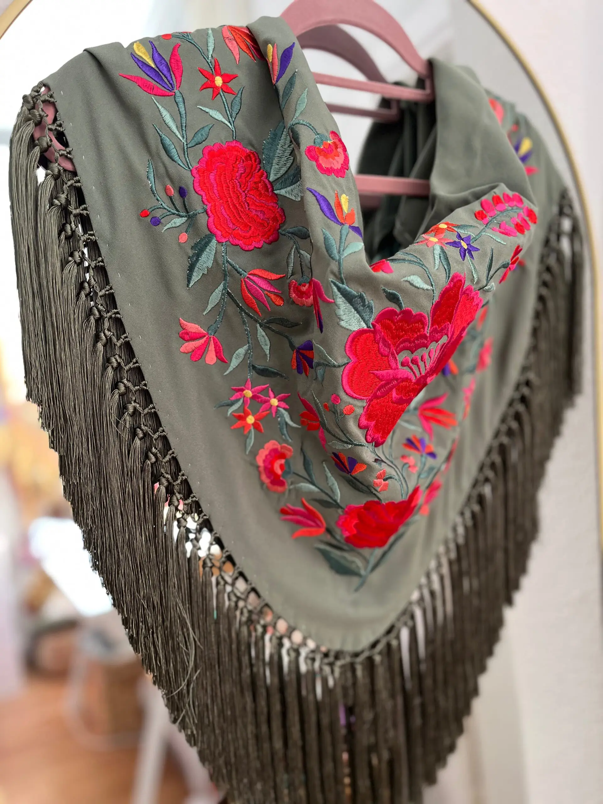 Mantoncillo artesanal bordado en algodón de seda y flecado a mano.