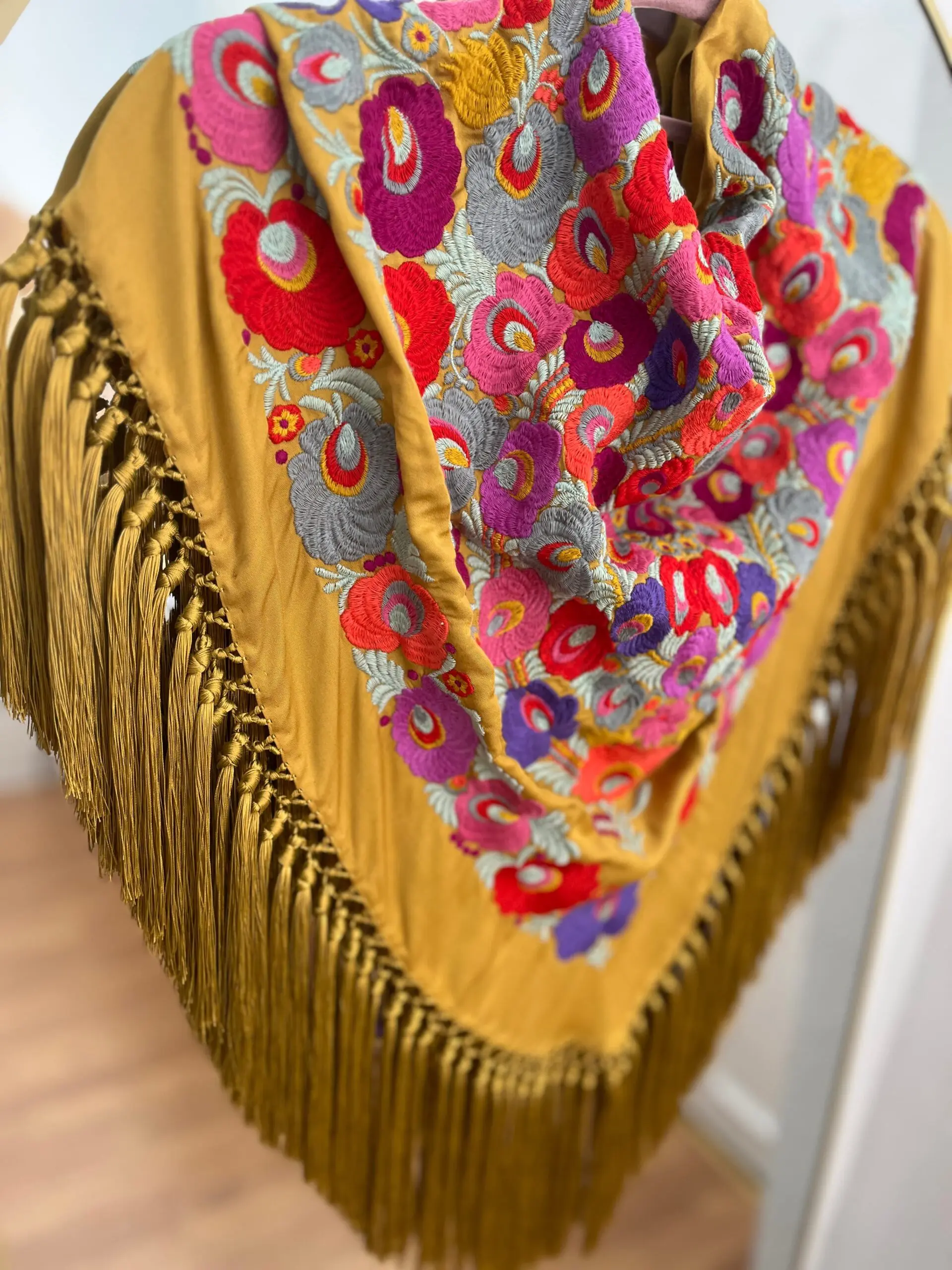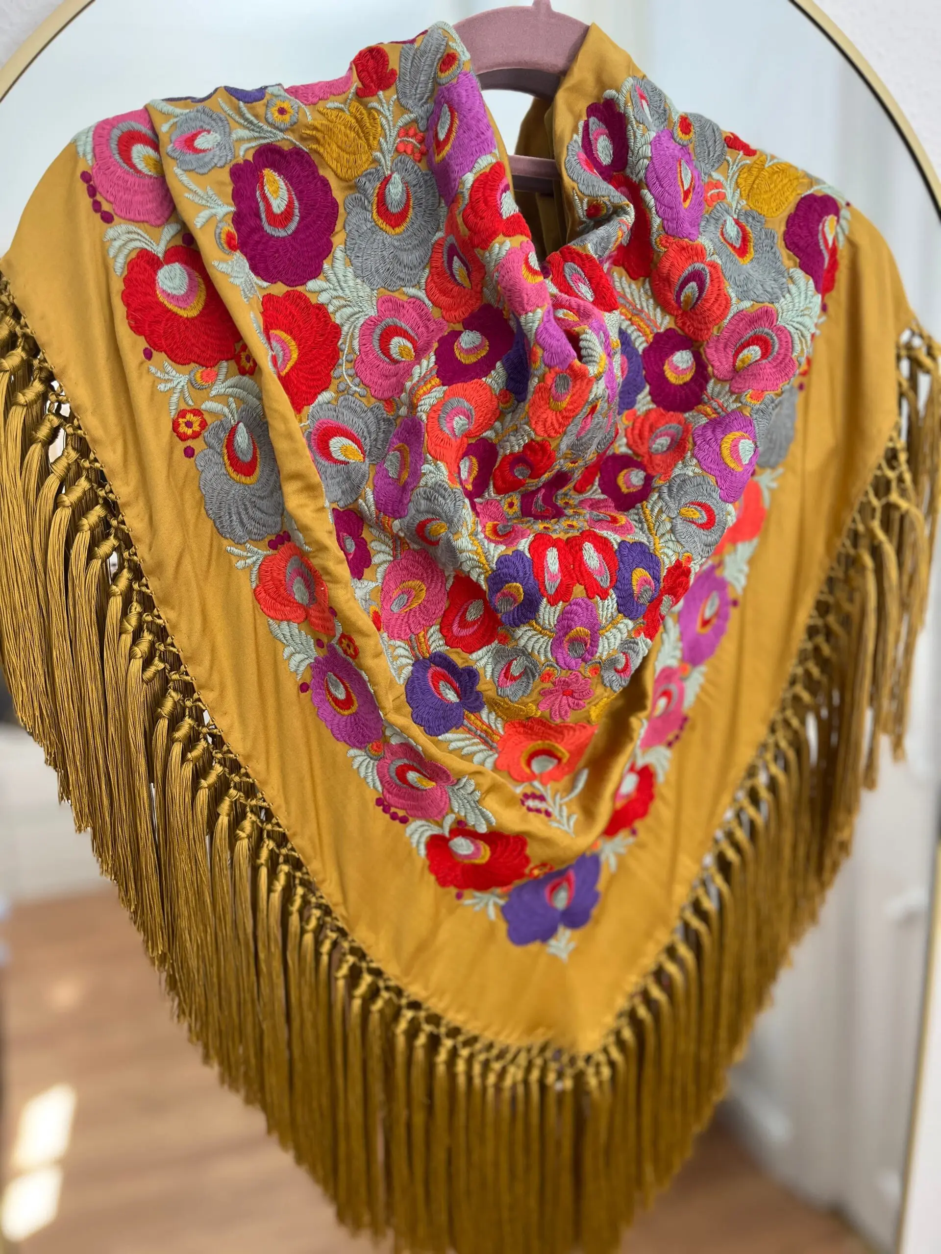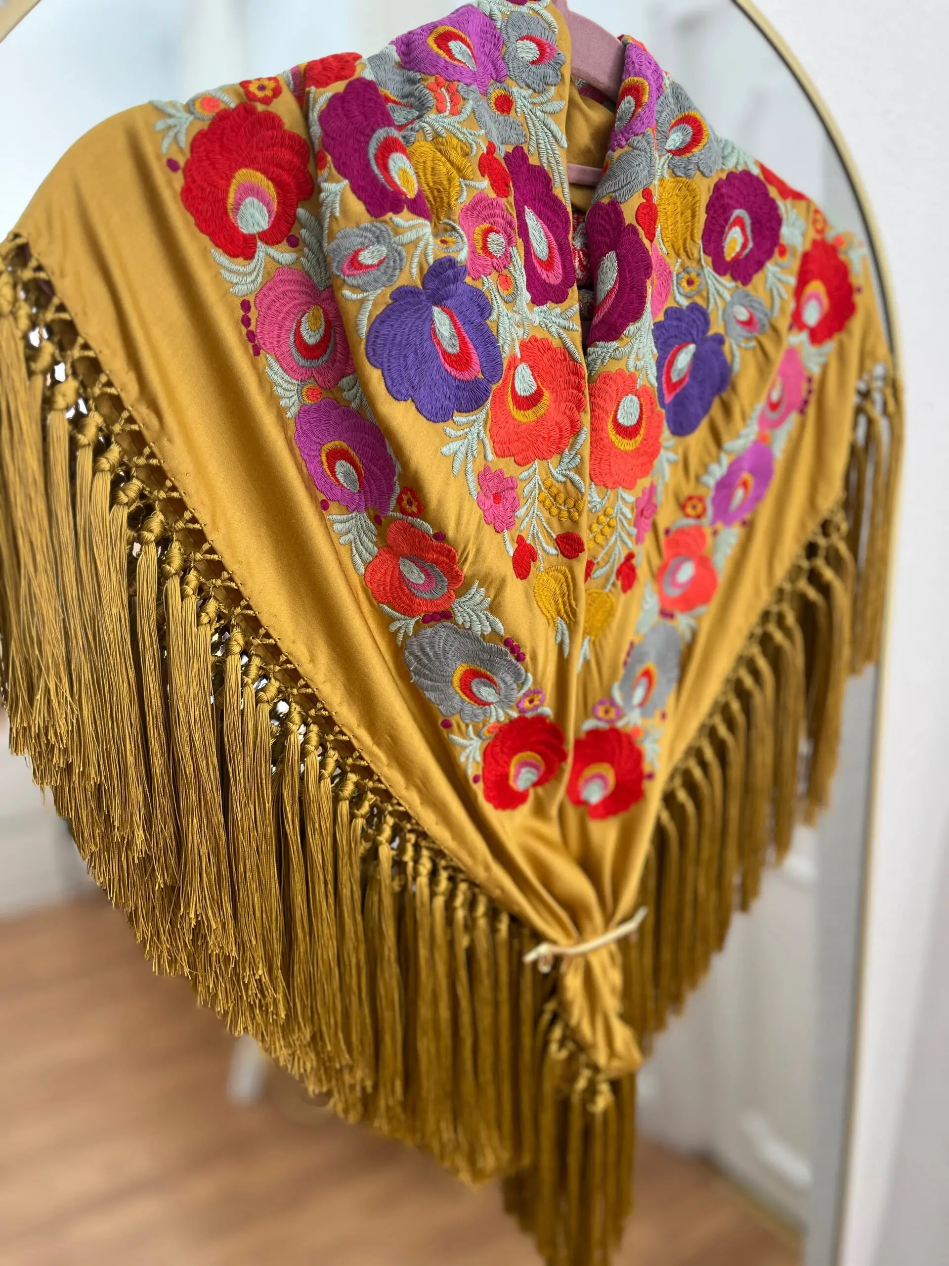 Producto artesanal. Tejido de seda hindú con viscosa. Bordado con hilo de algodón.Flecado a mano con hilo de seda de Rayón.