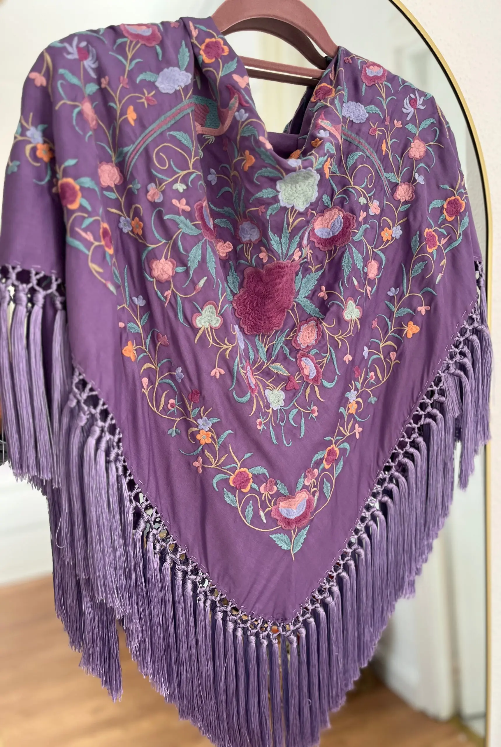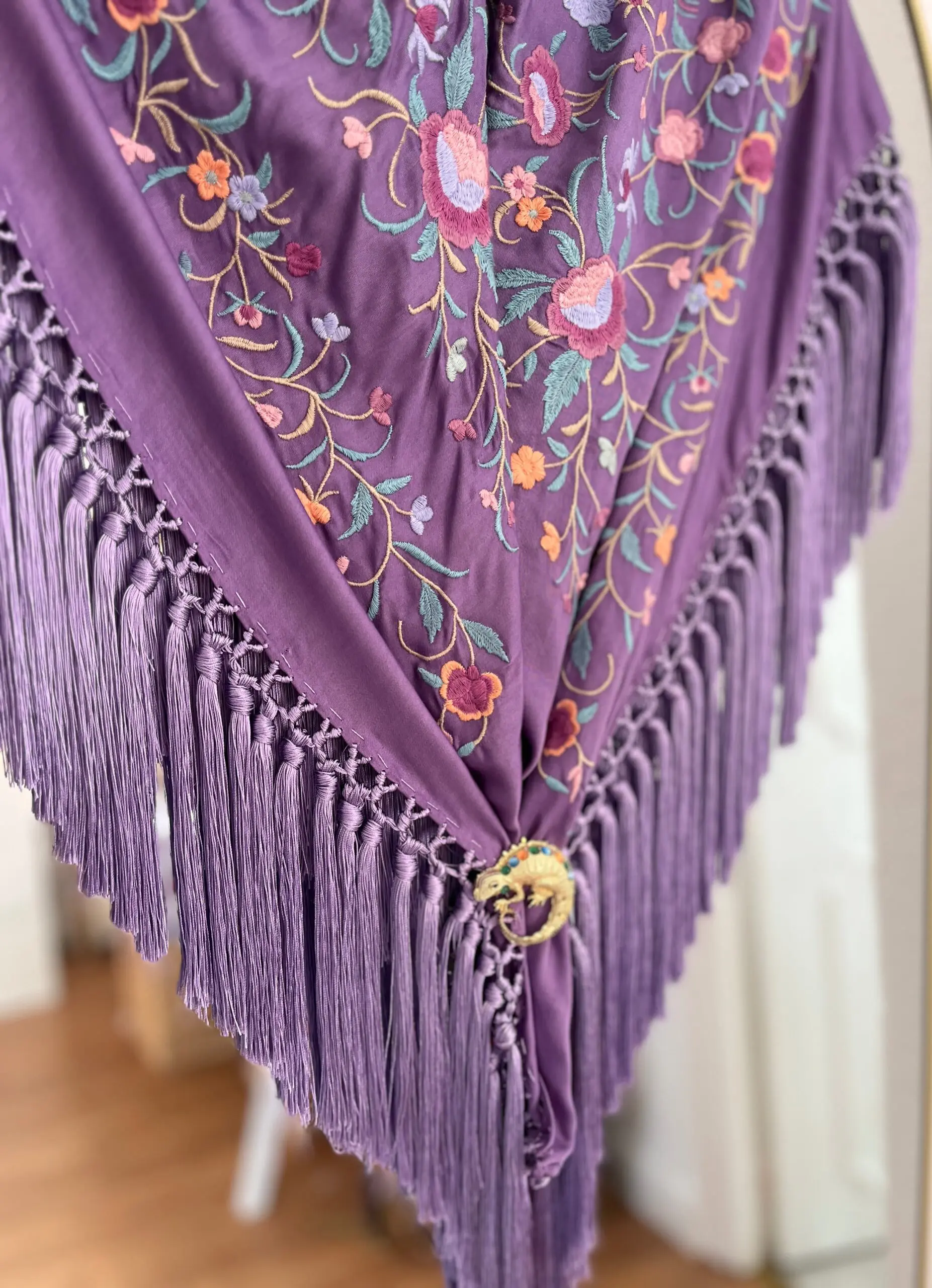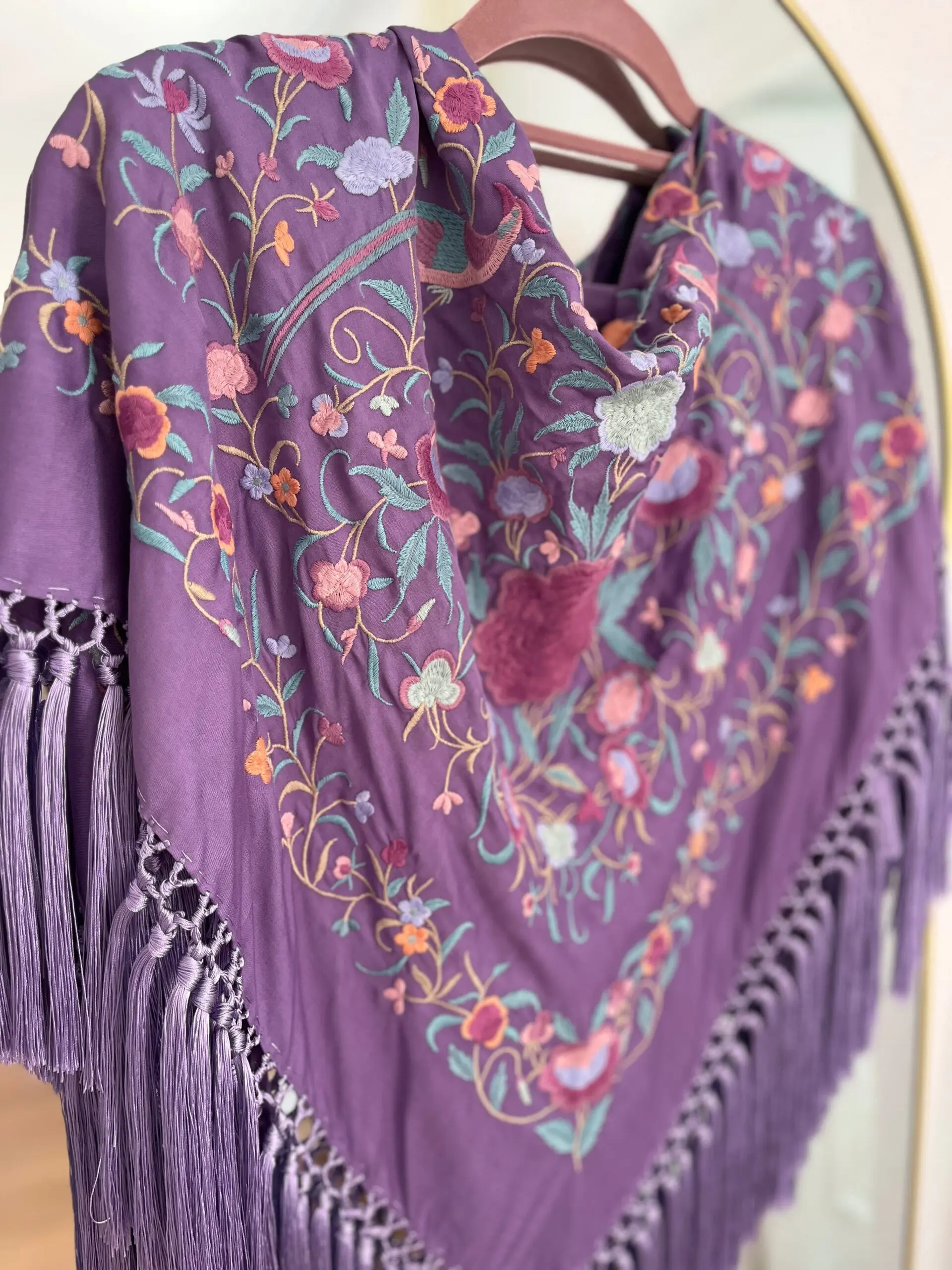 Producto artesanal. Tejido de seda hindú con viscosa. Bordado con hilo de algodón.Flecado a mano con hilo de seda de Rayón.