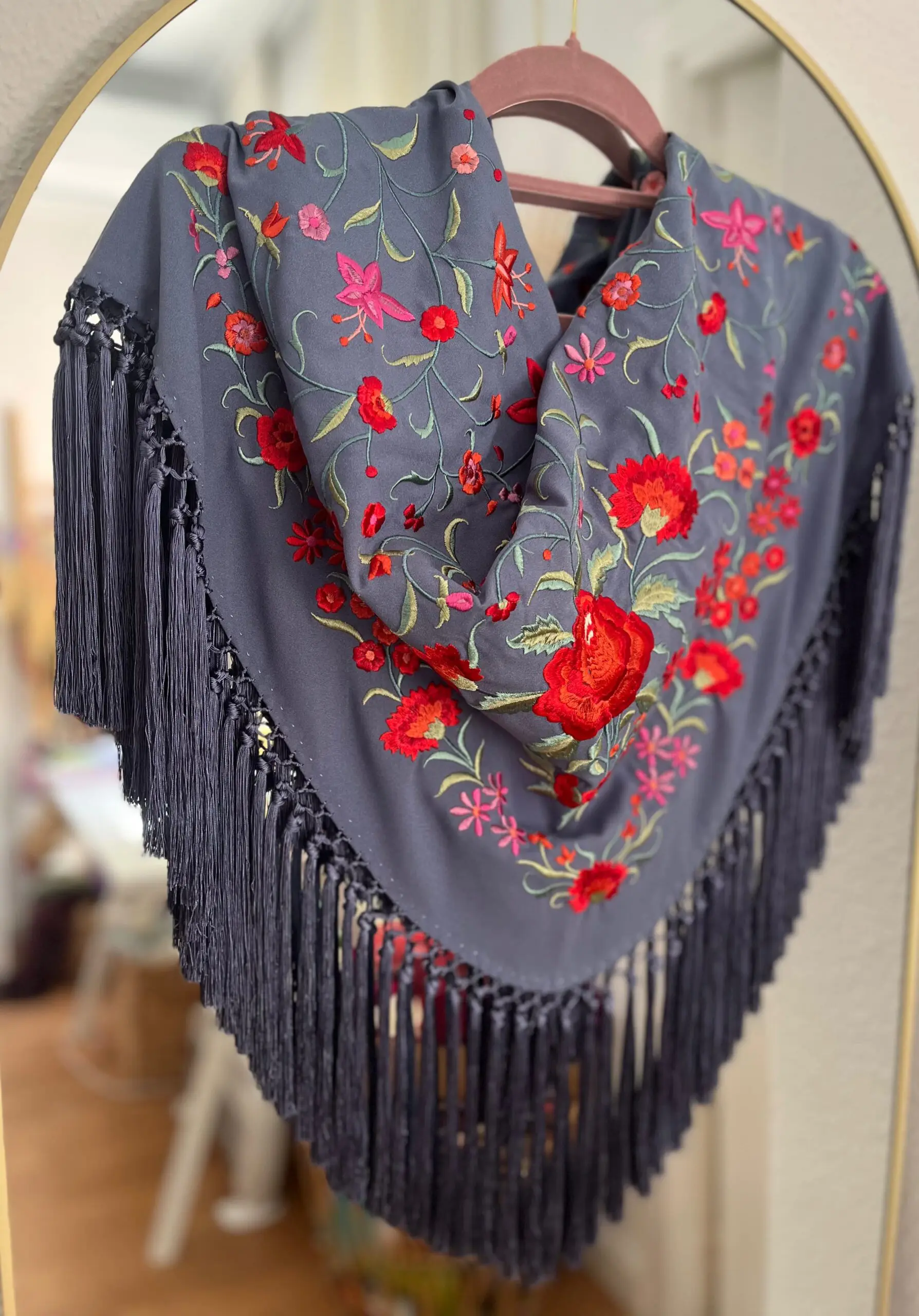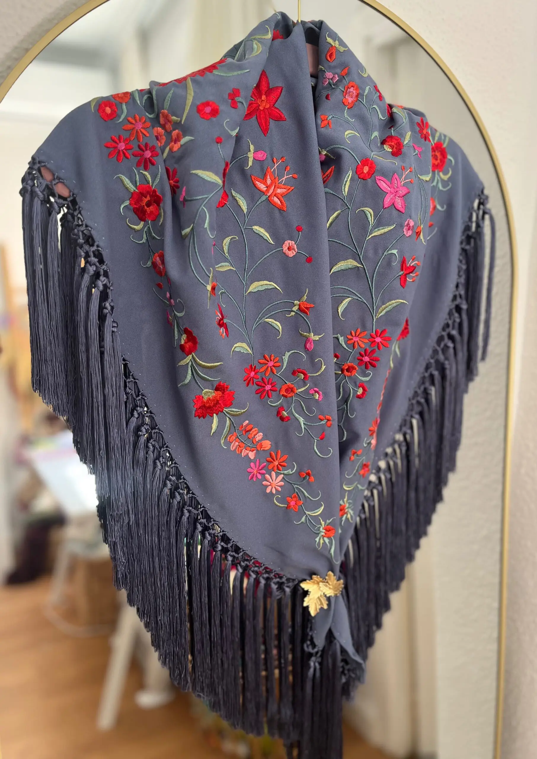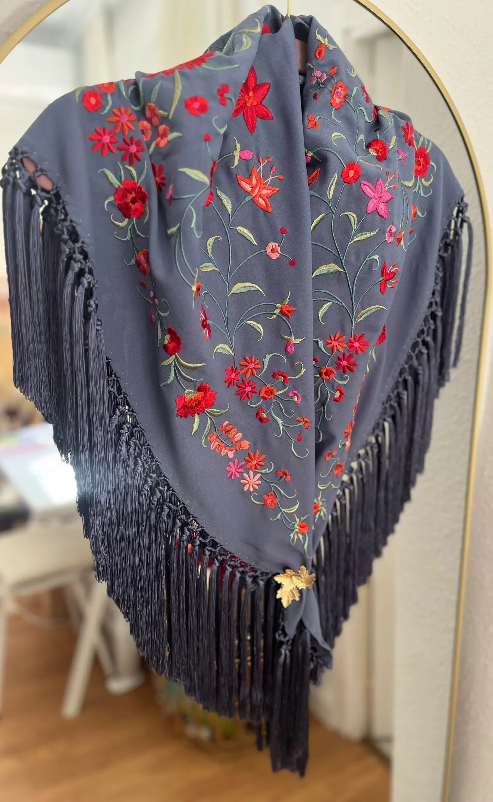 Mantoncillo bordado en seda y flecado a mano.
