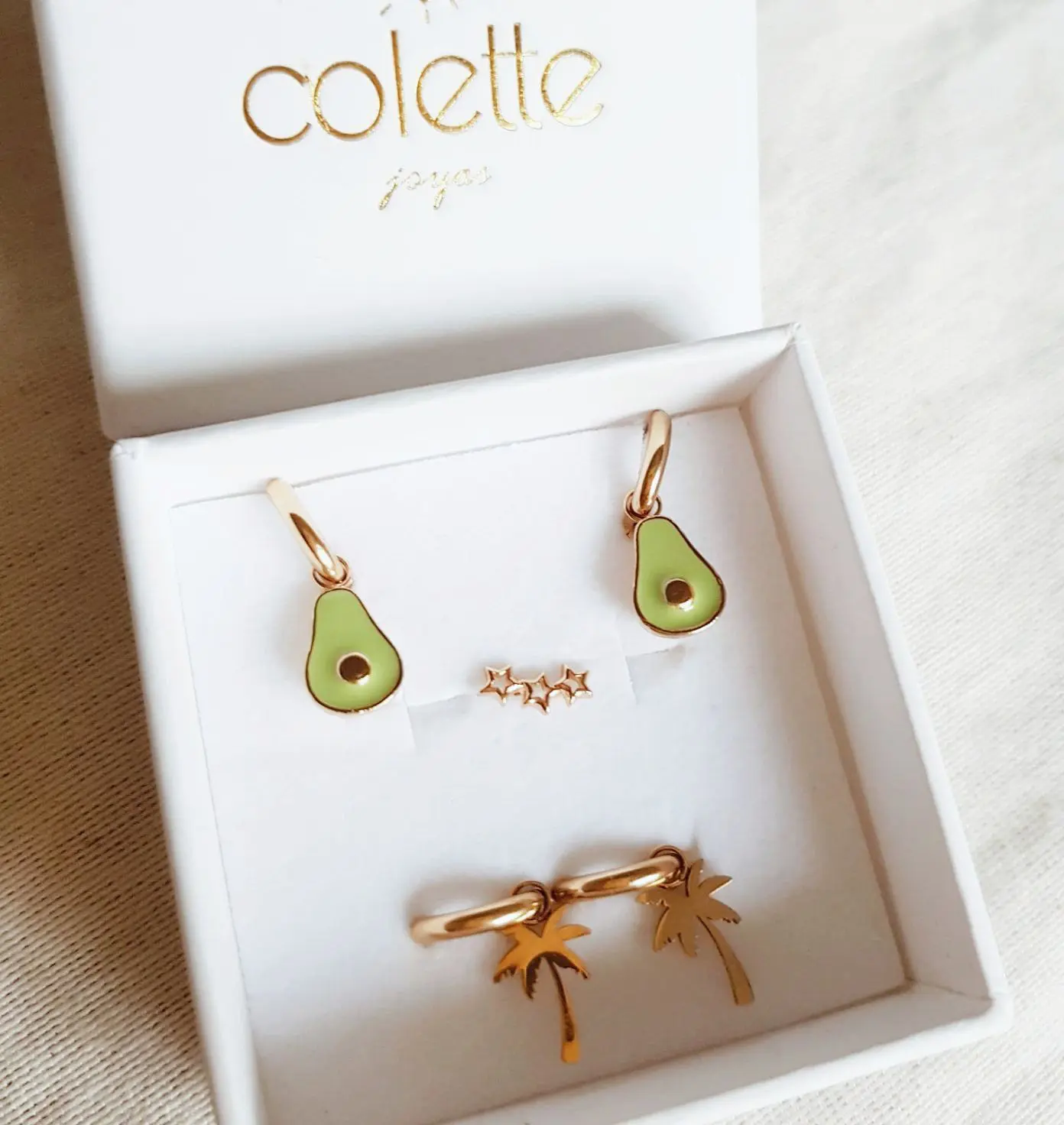 Par de aritos aguacate, par de aritos palmera, unidad pendiente multiestrellas