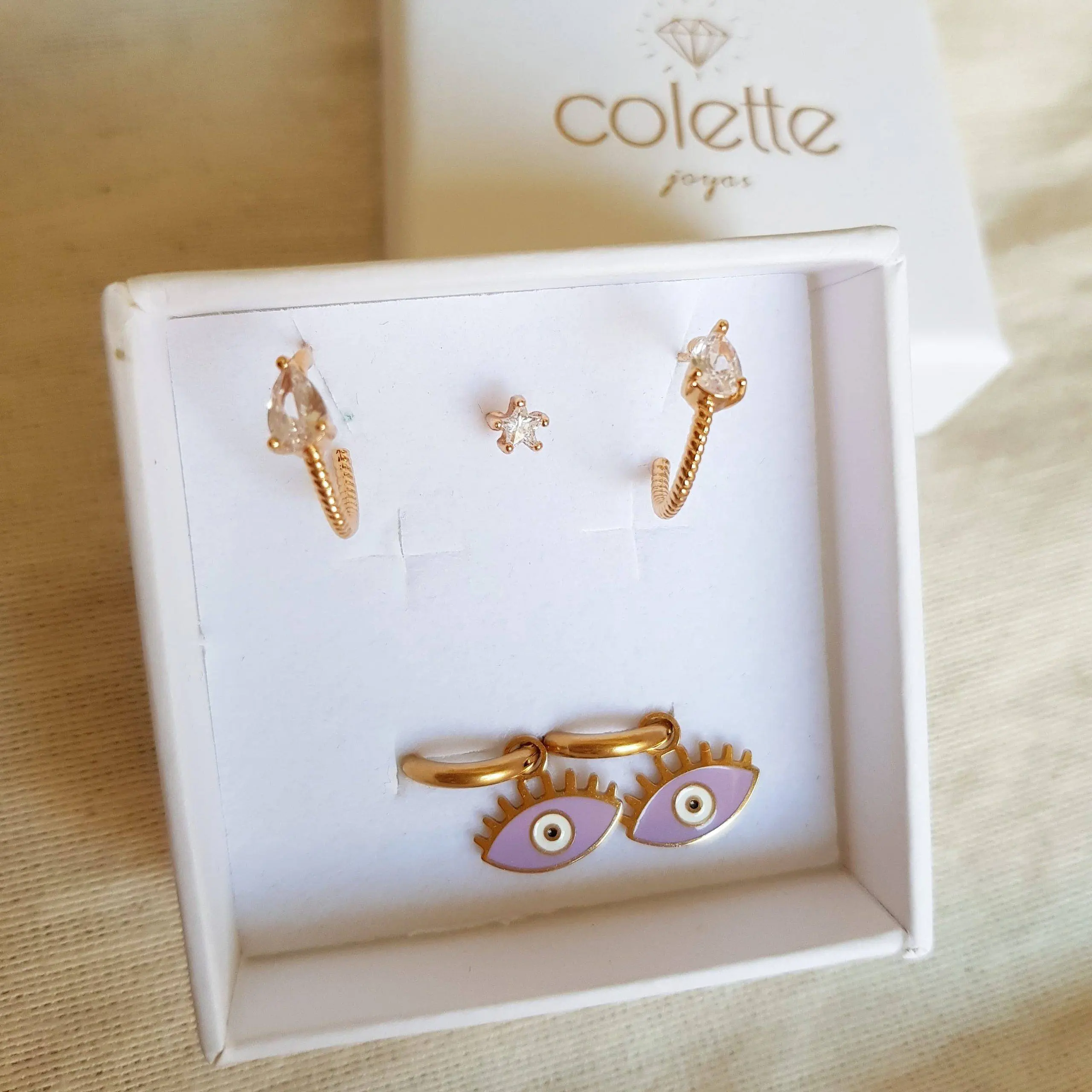 Par aritos cristal, par aritos ojos lila, unidad mini estrella brillante
