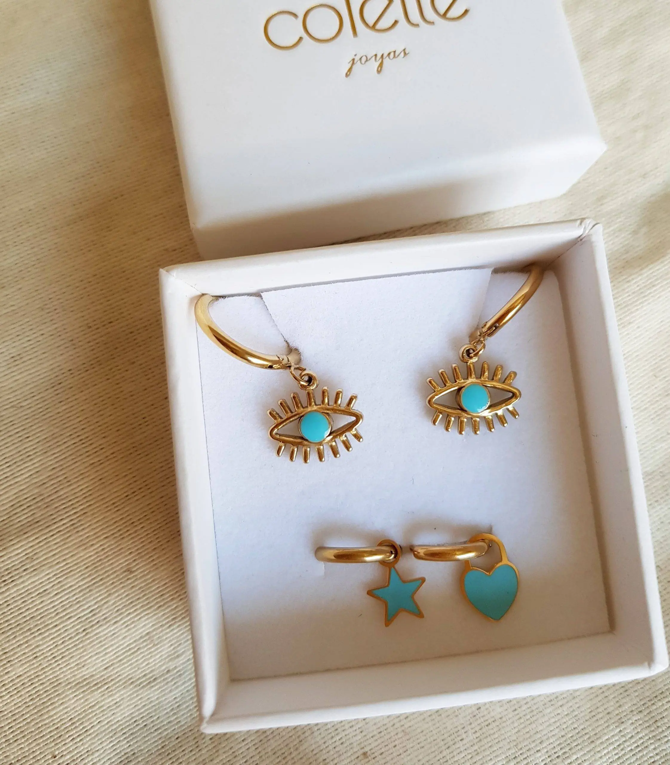 Par aritos maxi ojo egipcio, unidad arito blue heart, unidad arito Blue star