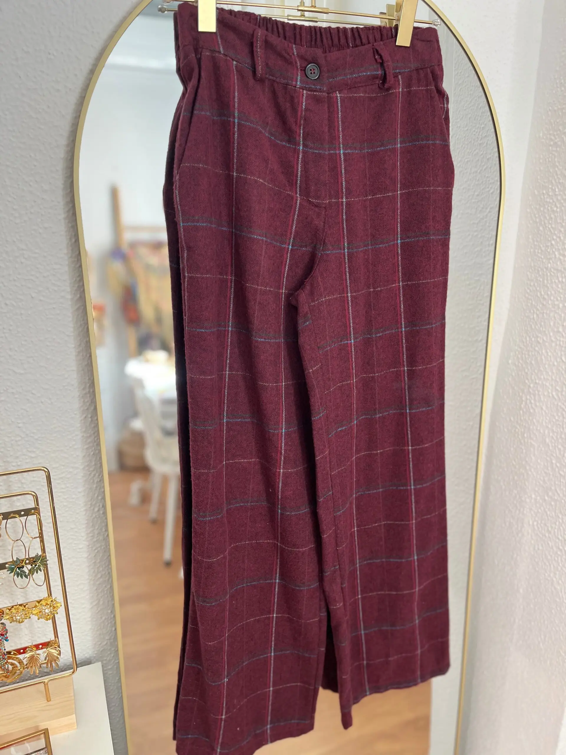Pantalón en un tejido de cuadro inglés o príncipe de Gales con líneas finas en tonos cálidos. Cintura alta, ajustable con estructura clásica.