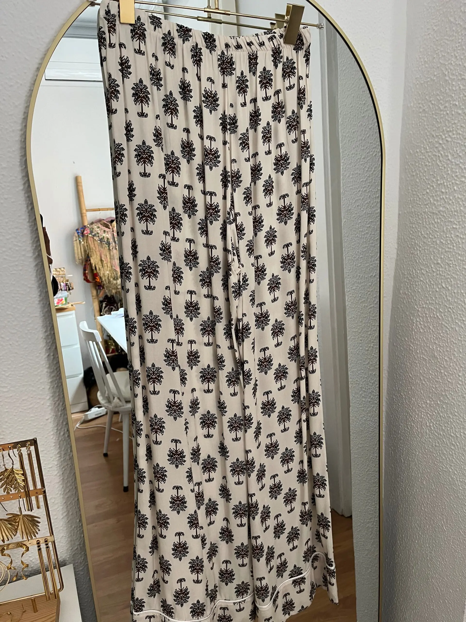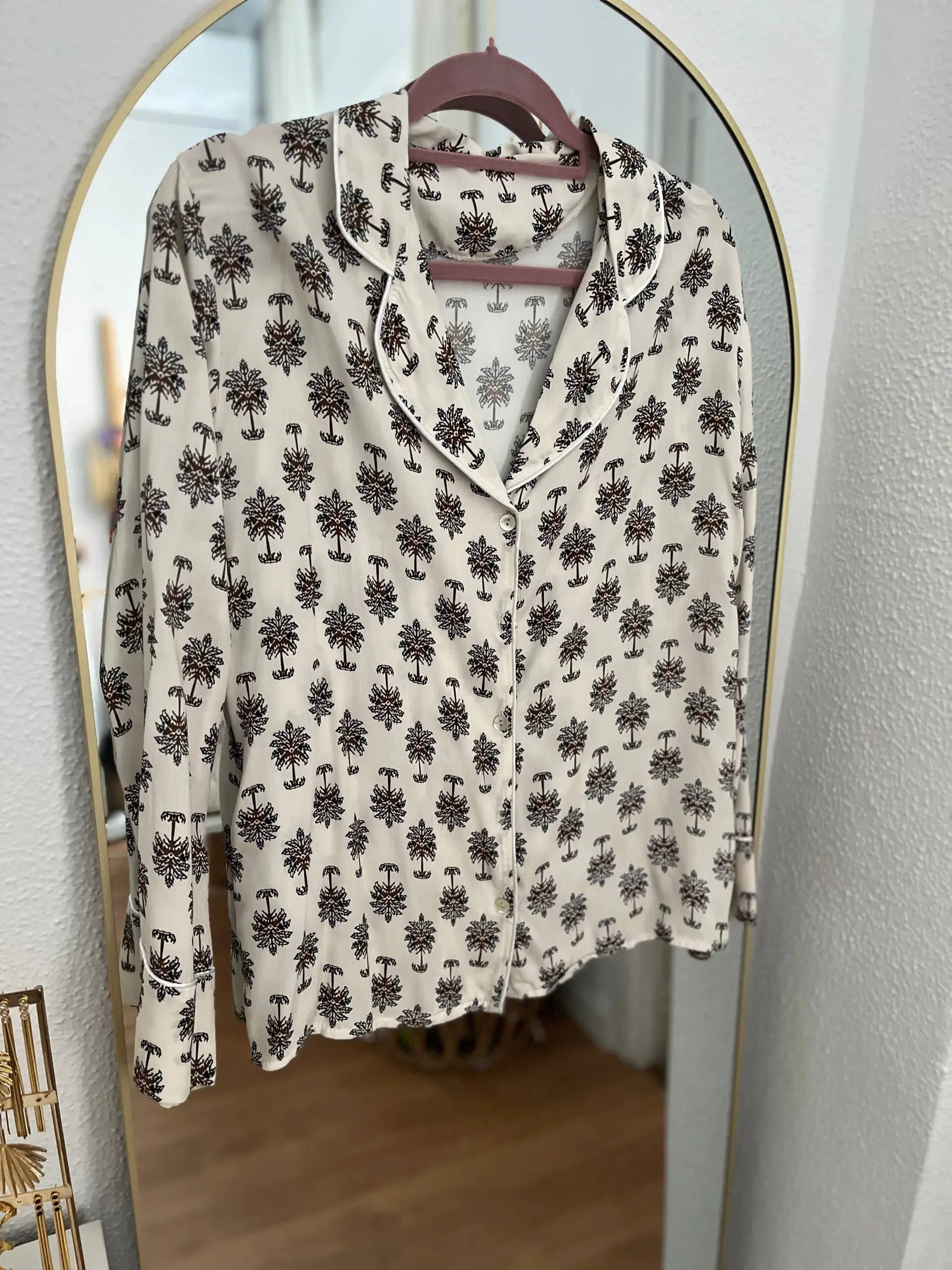 Pijama satinado con estampado de palmeras compuesto por camisa holgada y pantalón con elástico en cintura.
